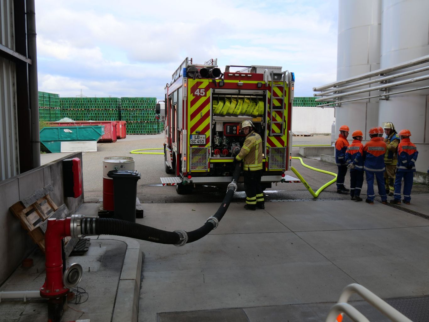 Das Übungsszenario umfasste einen Brand in der Lagerhalle mit mehreren vermissten Personen. Das Feuer drohte, auf ein angrenzendes Tanklager überzugreifen. Mehrere Trupps unter Atemschutz [es handelt sich hierbei um Übungsgeräte speziell für die Jugendfeuerwehr] retteten die Übungsstatisten aus der vernebelten Halle. Parallel wurden zwei Personen mit der Drehleiter vom Dach der Halle gerettet und eine Wasserversorgung aus dem Löschwasserbehälter auf dem Firmengelände aufgebaut. An der Übung nahmen ca. 70 Mitglieder der Jugendfeuerwehren und ihre Betreuer teil.