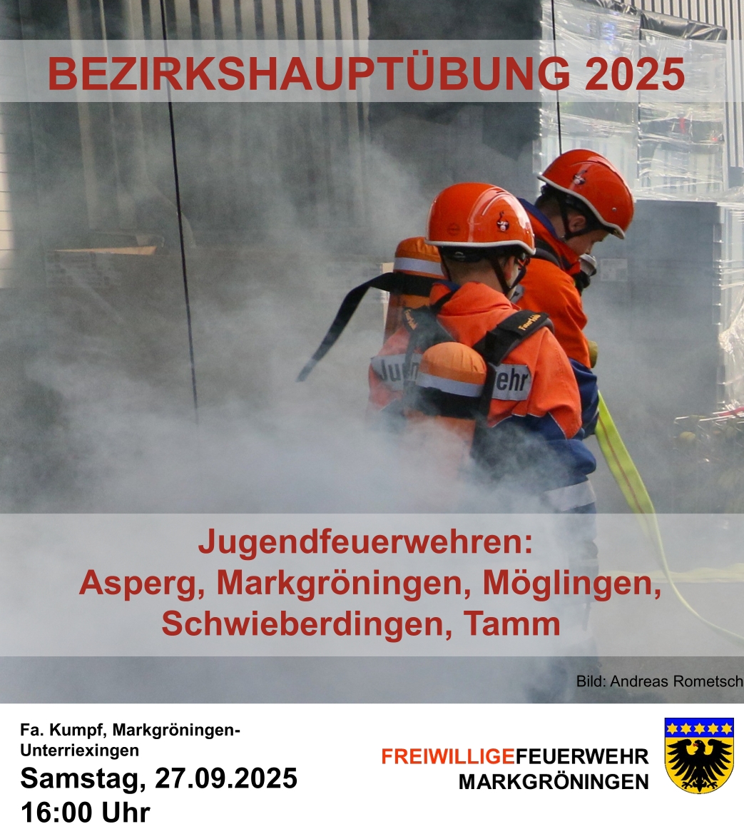 Am Samstag, 27. September 2025 fand um 16:00 Uhr die Hauptübung der Jugendfeuerwehren des Bezirks bei der Firma Kumpf in Unterriexingen statt. Der Bezirk umfasst die Jugendfeuerwehren Asperg, Markgröningen, Möglingen, Schwieberdingen und Tamm.