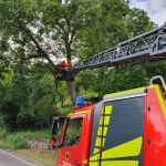 Bei einem größeren Nußbaum war in ca. 6m Höhe ein Ast gebrochen und drohte auf die Fahrbahn zu stürzen.