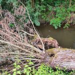 Aufgrund der Gefahr des Aufstauens des Gewässers beim nächsten Regen und des Abdriftens von abgebrochenen morschen Ästen beseitigte die Feuerwehr den Baum aus dem Bach.